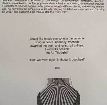 This manual contains words that will stand the test of time. It contains words you can keep referring to throughout your life journey. It contains words to live by. It contains words for thought. It contains words of great power. It contains words of life. It contains words to guide you. It contains words that show Its All Thought!